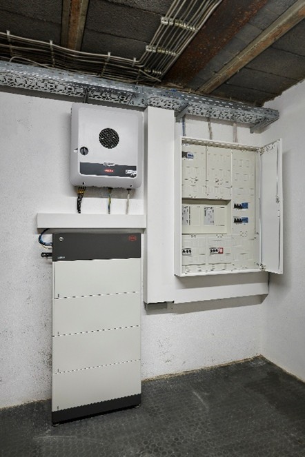 Das Bild zeigt den Solarregler einer PV-Anlage und einen Batteriespeicher im Keller eines älteren Hauses